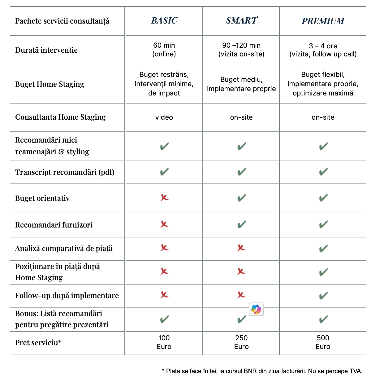 Un serviciu de consultanță Home Staging poate include evaluarea proprietății, recomandări pentru rearanjarea mobilierului, îmbunătățiri estetice, alegerea culorilor potrivite și sfaturi despre decor pentru a crea un impact vizual puternic.